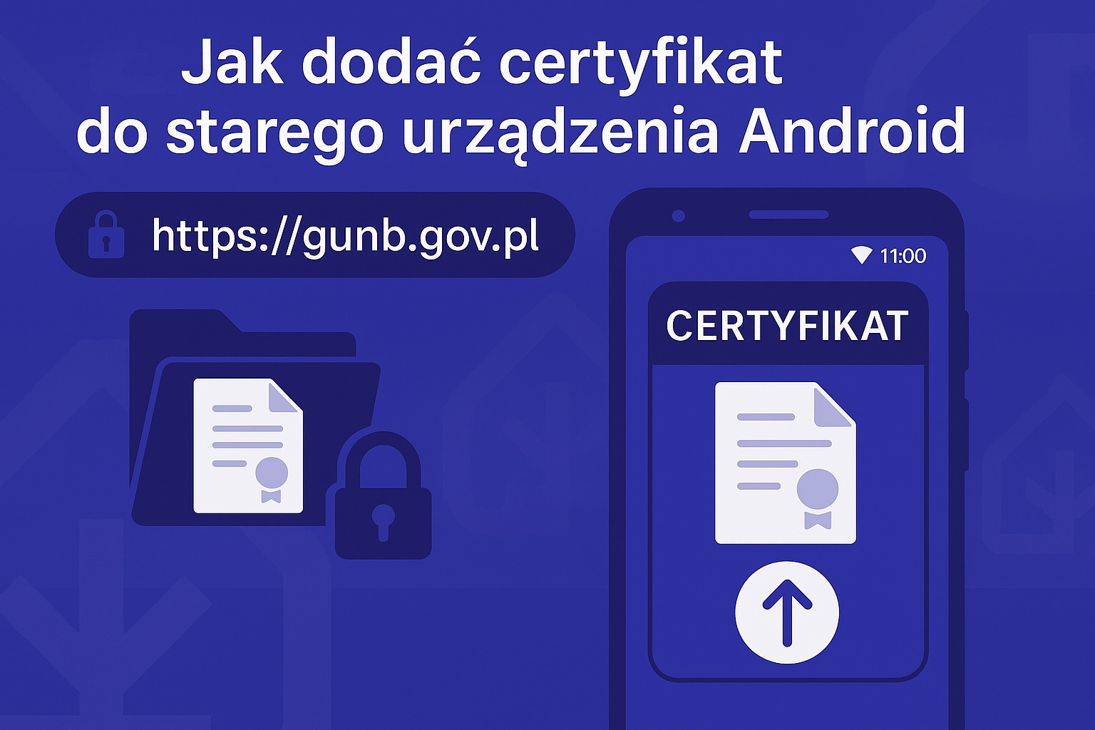 Starsze urządzenia z systemem Android mogą mieć problem z otwieraniem stron zabezpieczonych protokołem HTTPS, takich jak gunb.gov.pl. Aby rozwiązać ten problem, wystarczy zainstalować dodatkowy certyfikat bezpieczeństwa na telefonie lub tablecie.